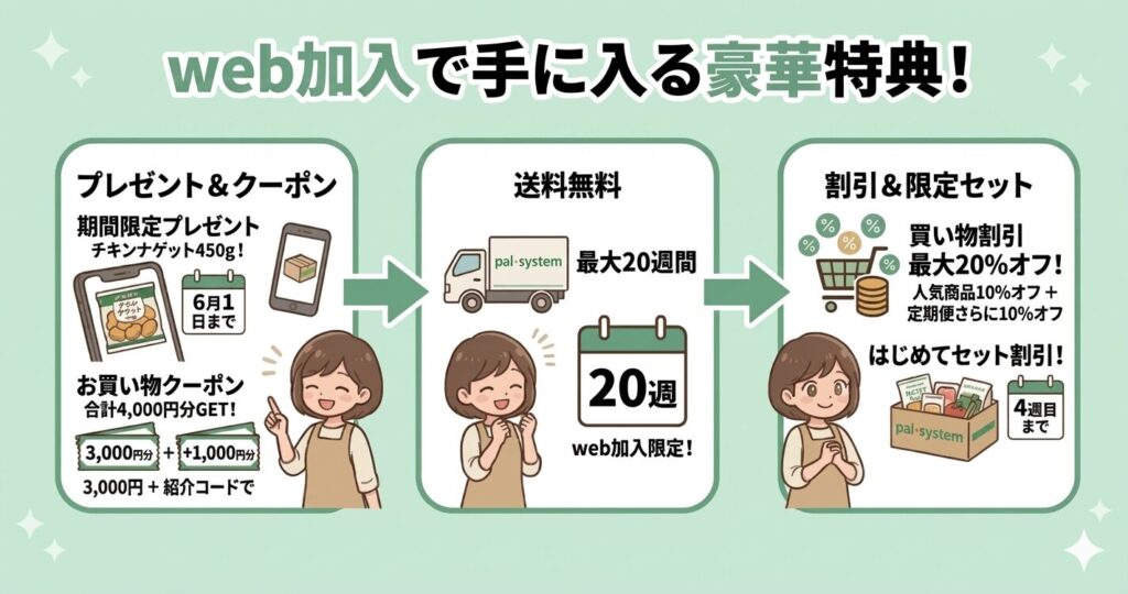 この順番で進めると、合計約14,000円分お得にパルシステムを始めることができます。